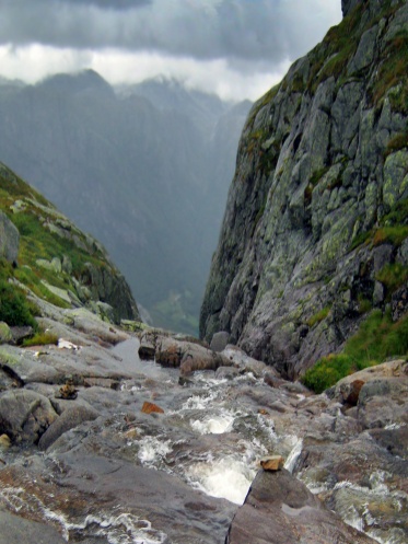 Но, при этом, выбрались, наконец, на плато. А плато Кьераг это голый камень, снег, сбегающие ледяные ручейки (это в середине августа-то!) и никаких укрытий в обозримом пространстве.