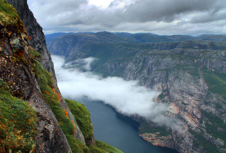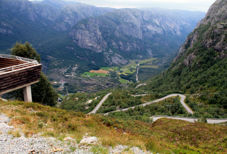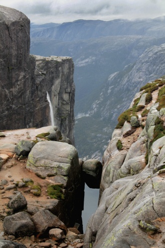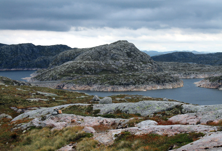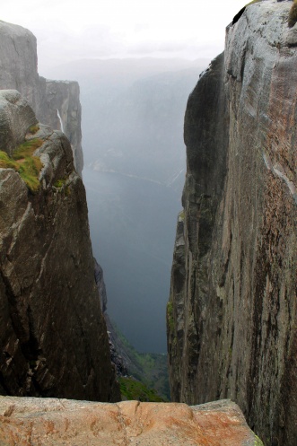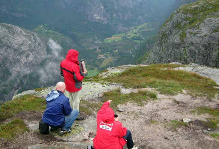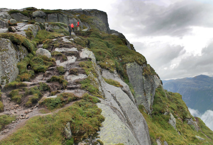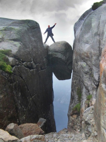 Из Осло до Люсефьорда, конкретнее – до Люсеботна, небольшого поселка на берегу фьорда, рассчитывали добраться часа за 4-4,5. Есть такие Интернет сайты, по которым можно рассчитать расстояние и даже узнать ориентировочное время движения между двумя пунктами. Вот от этого и «плясали». По прикидкам должны были оказаться на спуске к Люсеботну около 16 часов. Планировали оставить машину на площадке перед серпантином, ведущим вниз, а самим отправиться к знаменитой «горошине» - округлому камню, диаметром около двух метров, чудесным образом застрявшему между двумя отвесными скалами на высоте около 950 метров над водами фьорда. Очень хотелось наступить на этот камешек, сфотографироваться – вот какие мы смелые! Но это как максимум, а как минимум – увидеть, сфотографироваться рядом. С площадки, откуда начинается тропа, и до самой «горошины» мы намеряли по прямой около 4 км. Какие по дороге перепады высот мы не знали, но надеялись, что после небольшого подъема в начале пути, далее будет почти ровно. За сколько времени пройдем туда и обратно? Мы не молодые люди, троим из нас по 65, да и четвертой участнице похода уже за 50, но есть и многолетний опыт хождений в горах – геологическое прошлое. Учитывая это, ну, часа 4 точно хватит, даже с запасом! Значит, часам к 20 вернемся, как раз темнеть начнет, спустимся в поселок, откуда назавтра паромом продолжим наше путешествие по Люсефьорду, и на дальней его стороне еще и сходим на «кафедру» - тоже характерная живописная скала на самом обрыве, с которой люди делают чудесные фото фьорда.