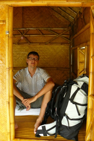 На остановке нас ждали несколько хозяев гостиниц, тк мы ничего не бронировали, то сдались на милость одного из них. Домики предлагались очень демократичные, цены начинались от 300. Самый дешевый показался мне уж больно близким к земле – еще залезет кто-нибудь. Взяли за 500. Скромное бунгалко на здоровых сваях.