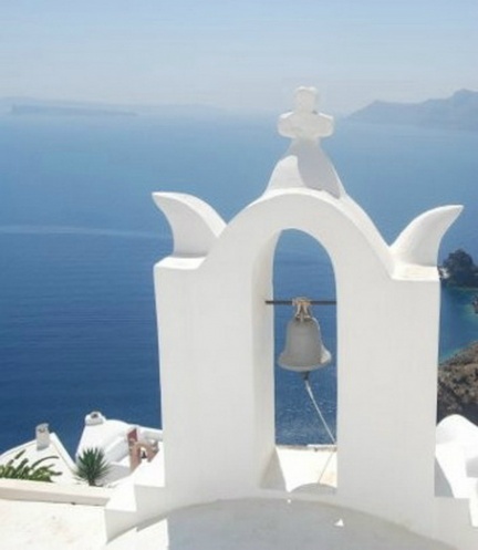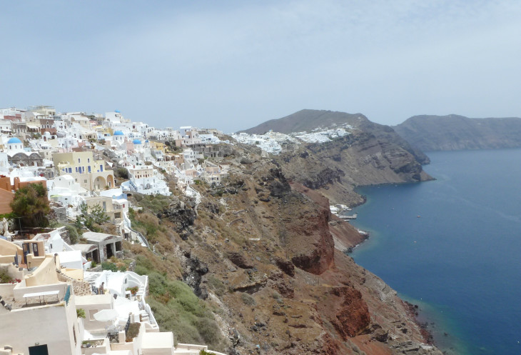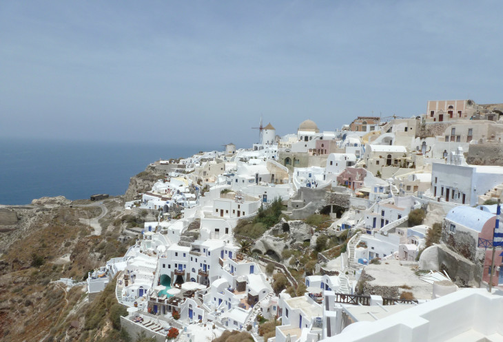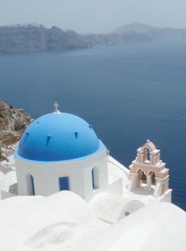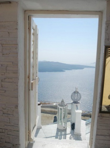 Всплыли в памяти завораживающие красотой виды на кальдеру, каскады белоснежных домиков с синими ставнями, сбегающие по крутым склонам, ярко-голубые купола церквушек и узкие улочки, знаменитые двери Фиры и мельницы Ии, ароматное Винсанто…