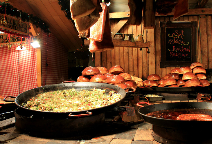 На площади раскинулся огромный новогодний базар со всевозможными сувенирами, сладостями, копченостями и горячими блюдами и винами. Очень здорово!