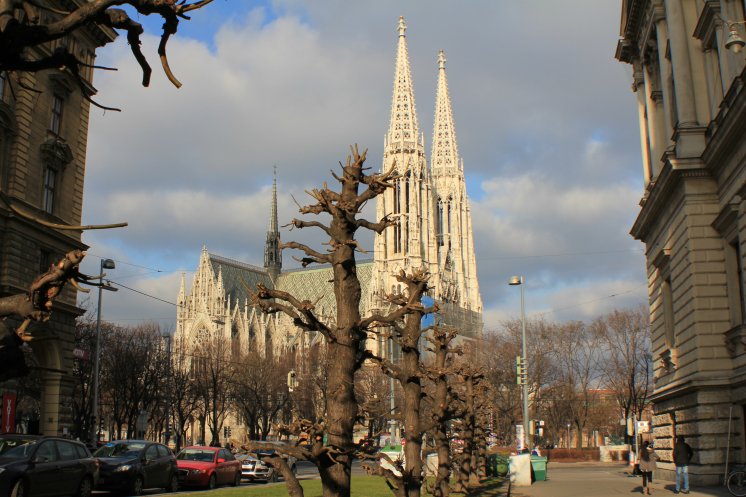 Прошли немного вперед и увидели церковь Вотивкирхе (Votivkirche), это сейчас я знаю про нее, а после поездки всех друзей на сайте донимала вопросами: «Что за здание»? Это огромная неоготическая католическая церковь, которая была построена в 1853 году; одно время она служила гарнизонной церковью.