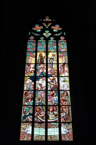 Костел построен в готическом стиле с огромными окнами-витражами. Внутри - огромный орган, украшенный также раскошно, как и российские храмы. Тем не менее, само убранство достаточно скромно - стены расписаны библейскими мотивами, однако, в них отсутсвует золотое покрытие, как это принято в русской православной церкви.
