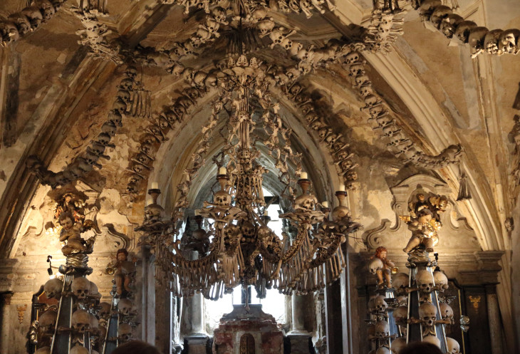 Внутри помещение условно делится на два зала. В первом по обе стороны от входа находятся костехранилища, потолок второго украшен огромной люстрой (естественно из костей), в центре установлены посвечники, а на одной из стен выложен герб Шварценбергов, которые внесли непосредственный вклад в создание костела. В соборе темно и довольно холодно, единственное освещение - свечи, установленные у креста, и нстественные лучи дневного света, просачивающиеся сквозь витражи окон.