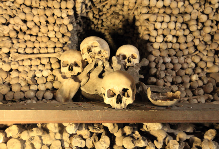 Люди для чего-то оставляют монеты, некоторые бросают их в груды костей.