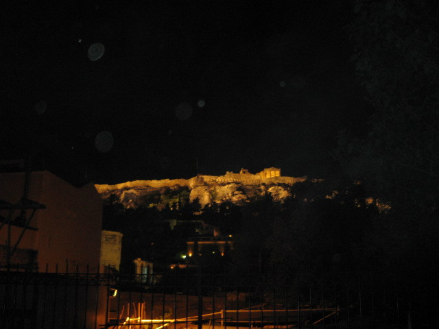 Вечерние Афины нам очень понравились: везде веселые отдыхающие люди гуляют или сидят в кафешках и пьют кофе среди освещенных античных развалин, на одном амфитеатре даже проходил какой-то концерт. До Акрополя дойти было нетрудно. Мы даже поднялись до половины на этот довольно высокий холм, но уперлись в ворота музея, который был в это время, естественно, закрыт. Попали на Акрополь мы уже через день. Вид с холма на город открывается замечательный. Может быть, для греков Афины ― это ужасный загазованный мегаполис, но жители Москвы увидели только большой уютный южный город, где бок о бок с античными развалинами стоят современные дома:) Уж в чем, а в мегаполисах мы немного разбираемся:)) Потом мы вышли на какую-то удивительную широкую улицу, всю заставленную столиками, где молодежь пила кофе и оживленно общалась. Наверное, это была Плака. Оттуда мы дошли до ближайшего метро и вернулись обратно в отель. Наутро мы так и не смогли добиться от туристов, которые сначала хотели с нами идти, почему они испугались такой приятной прогулки. «Ну, мы не знаем, а вдруг..? Мы лучше деньги заплатим за экскурсию...» Ну что же, если денег много, почему бы не заплатить?:)