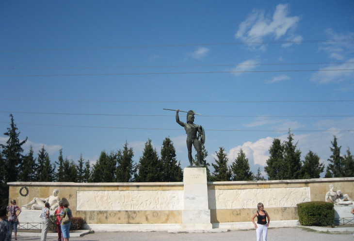 Потом нас провезли мимо президентского дворца, где стоят гвардейцы в национальных костюмах, которых все туристы фотографируют (бедные ребята!). После этого мы распрощались с нашим временным гидом и отправились наконец на Халкидики, где нам предстояло целых два дня отдыхать. По пути проезжали знаменитые Фермопилы, где стоит памятник царю Леониду и 300 спартанцам, погибшим во время нашествия персов на Элладу в 480 г. до н.э. Рядом стоит памятник погибшим в битве феспийцам, который изображает одного из главных богов древнегреческого города Феспии Эроса без головы со сломанным крылом. Памятничек, как бы помягче сказать… не очень приличного вида (по этой причине здесь фотография только первого памятника).