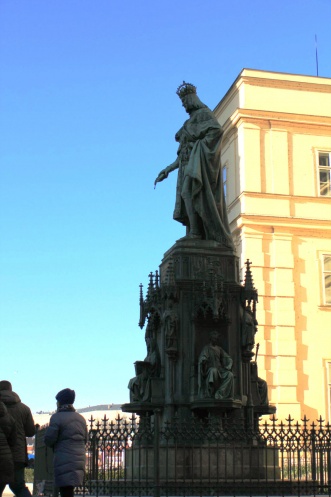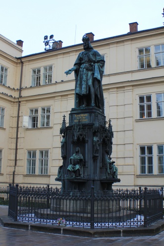 Перед башней на площади установлен памятник Карлу IV. Он был возведен в честь 500-летия Карлова университета, а фигуры на пъедестале изображают четыре факультета - теологический, юридический, медицинский и философский: