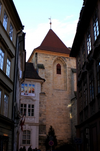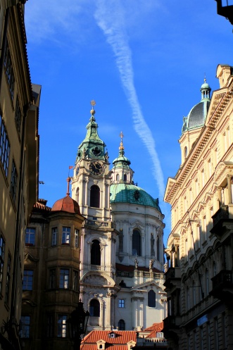 Пройдя через мост, оказываемся на Малостранской площади с собором Святого Николая. Рядом с церковью находится башня, которая воспринимается как храмовая колокольня, однако таковой она вовсе не является. Колокол на башне действительно висел, но принадлежал он не храму, а городу, и должен был предупреждать горожан о вражеских нападениях: