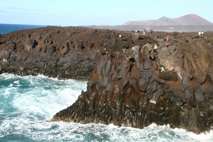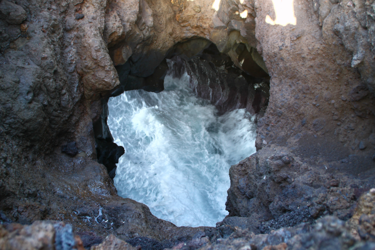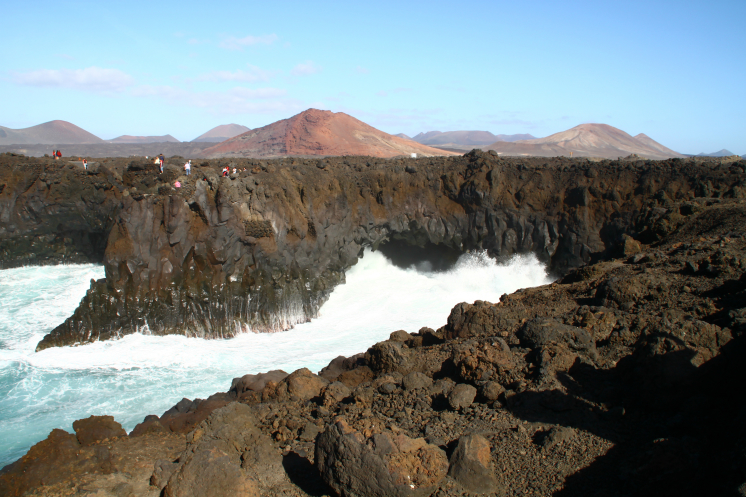 Следующим пунктом были смотровые площадки Los Hervideros. Это место встречи лавы и океана. Силой Атлантики в лавовых потоках образованы пещеры. Рокот волн здесь оглушающий, и звуки и вид поражают воображение, волны разбиваются о застывшую лаву с неимоверной силой, брызги от них поднимаются на метры от поверхности воды.