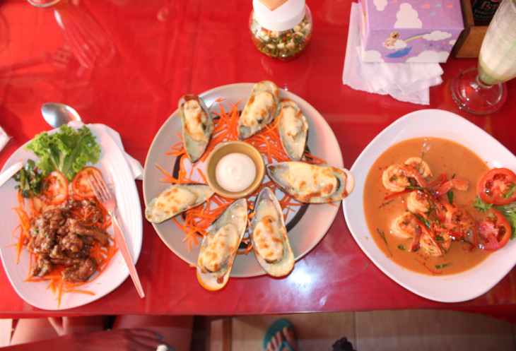 Кстати, вообще не напрягало вечером питаться не в отеле, а каждый раз – в новом кафе. Выбор блюд очень разнообразный и по скромным ценам. Кушали фрукты(дешево и много),брали их уже разделанными в лоточках, морепродукты, не боялись пробовать местное, с макашниц(такой дядька на мотоцикле с чаном бульона вместо коляски. Он обычно кормит местных, заливая этим бульоном в тарелке самые разнообразные ингредиенты, не все узнаваемо, но оооочень вкусно!)