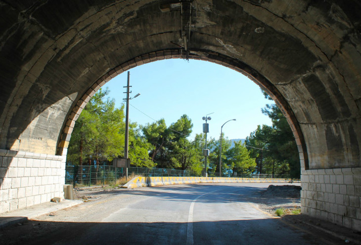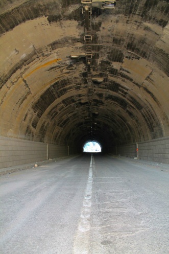 Дорога слева ведёт нас в тупик. Едем на правую. Но не разворачиваемся, а едем через этот тоннель.