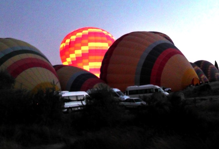 В 5.30 утра нас, тех, кто пожелал полетать на воздушных шарах, забрали из отеля и повезли к месту старта. Очень интересно было наблюдать еще в темноте на фоне чуть светлеющего неба, как горячим воздухом надуваются огромные купола шаров.