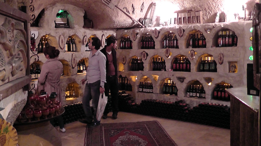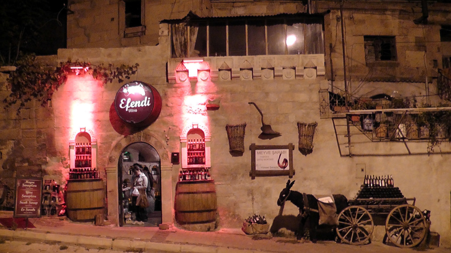 Затемно приезжаем в городок Ургюп, поселяемся в гостинице, ужинаем, немножко прогуливаемся. Заходим в очаровательный винный магазинчик: