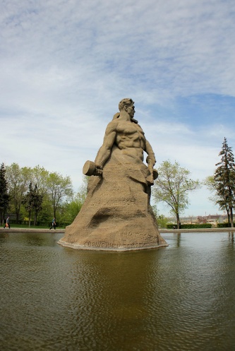 Композиция отражает трудный период Сталинградской битвы: как бы из самой великой русской реки поднимается советский воин-богатырь и, презирая смерть, становится на защиту родного города: