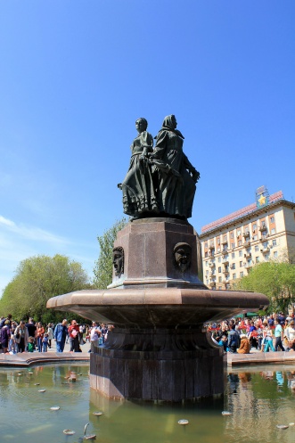 13. Центральную набережную Волгограда открывает фонтан «Искусство». Другое его название – фонтан «Дружбы народов». По центру верхней террасы набережной расположен фонтан, на котором возвышается постамент из красного гранита с бронзовой фигурой. Скульптура из трех девушек, исполняющих танец в народных костюмах, создана по мотивам всемирно известного танцевального коллектива «Березка».