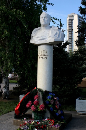 2. Бюст маршала Советского Союза Жукова Георгия Константиновича установлен возле музея-панорамы "Сталинградская битва". Трудно переоценить вклад выдающегося полководца в победу под Сталинградом. За успешное руководство контрнаступлением в ходе Сталинградской битвы в 1942 г. Жуков первым в стране был удостоен ордена генералиссимуса Суворова 1-й степени.