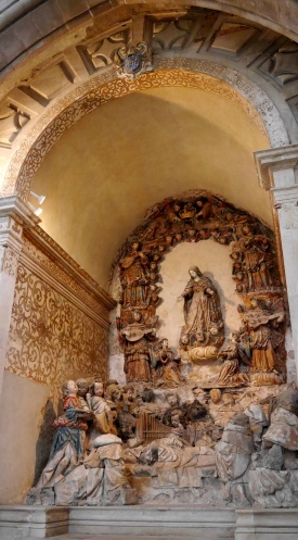Одна из главных достопримечательностей замка тамплиеров– церковный неф с растительными и символьными элементами орнамента и совершенно фантастическое окно, в котором нашлось место чуть ли не всем символам мануэлино. Лицо стиля, его флаг и гордость. Говорят, что Англия была готова простить весь внешний долг Португалии за право владеть этим окном, потому что в его кружеве зашифровано послание тамплиеров о Чаше Грааля.