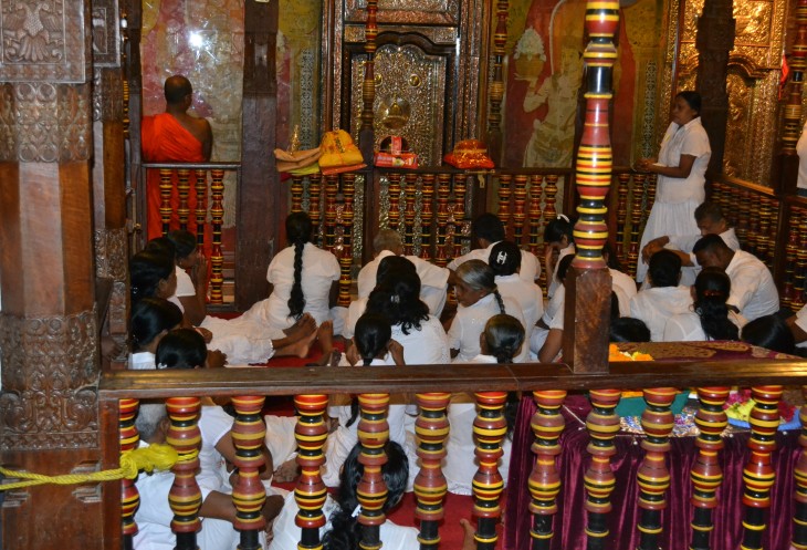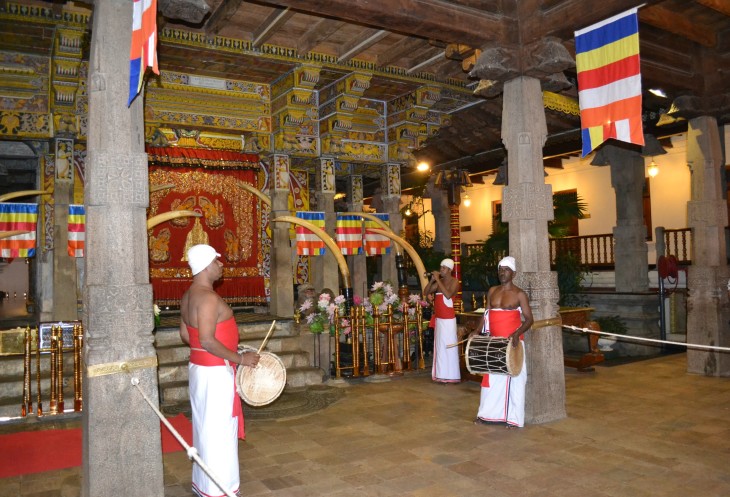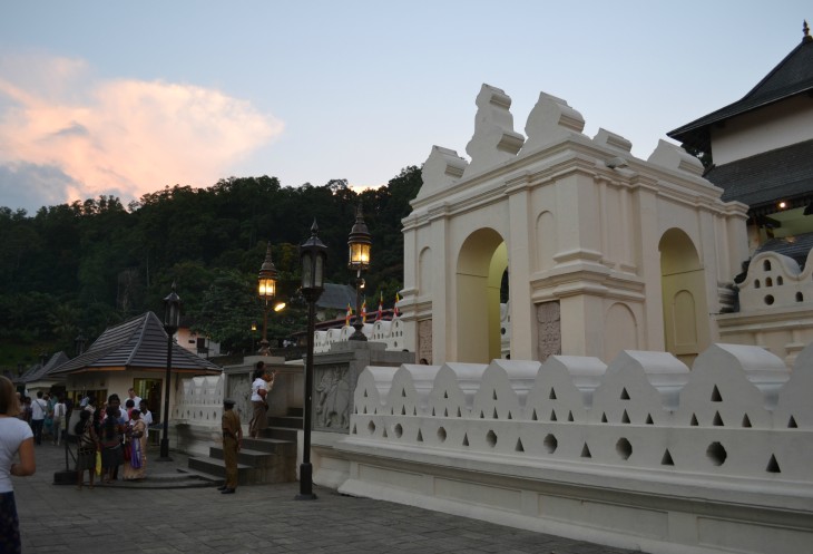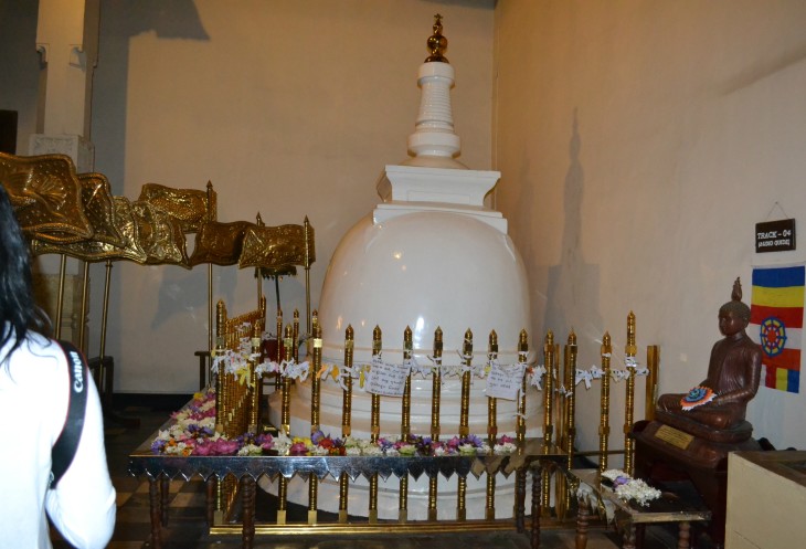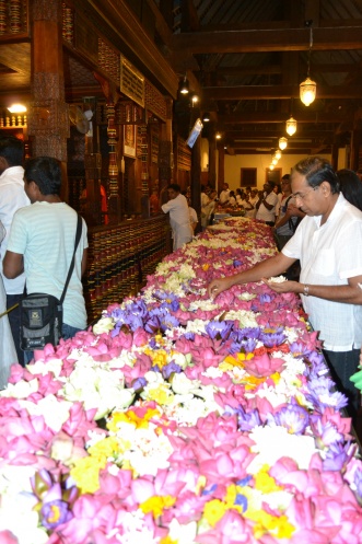 Перед храмом "Зуба Будды" Инди подсуетился и достал нам платки (из-за неподобающего внешнего вида), повязал их нам , мы прошли через рамку металлоискателя и охранников и пошли гулять по комплексу. Храму около 250 лет , внутри храм поражает своей роскошью. Он украшен великолепными фресками. На них изображены все двадцать четыре Будды- предыдущие воплощения Будды Гаутамы. Священная реликвия храма - "Зуб Будды",- был привезен на Цейлон в 371 году. По преданию, правитель Калинги, терпя поражение в войнах и опасаясь за судьбу своего государства, решил отправить святыню на Цейлон. Его дочь спрятала "Зуб Будды" в прическе и переправила реликвию на остров. С давних времен существовало поверье, что этот зуб обладает волшебной силой, кому он принадлежит, тому принадлежит власть. Во внутреннем дворе храма находится хранилище, а в нем за решетками комнаты, постоянно охраняемой двумя монахами, в ковчеге, состоящем из семи золотых вложенных в друг друга сосудов, хранится реликвия храма- "Зуб Будды". От вечернего действие в храме, аж дух захватывало. Старинные золотые чаши , стоящие в храме были заполнены рисом и молоком, везде бесчисленное количество цветов.