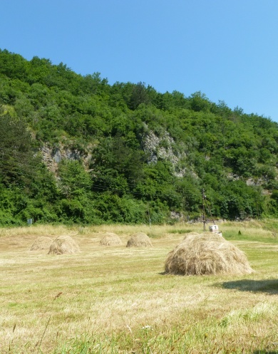 Вдруг она прячется в зелени травы и кустов, перед нами возникает поле с небольшими стогами сена, а за ним стены древнего монастыря, к которому ведет аккуратная дорожка.