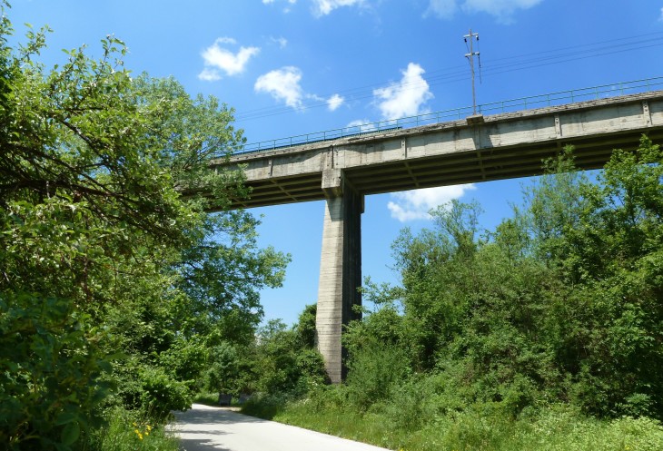 Вот и город закончился, впереди на высоких опорах железнодорожный путепровод.