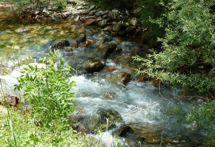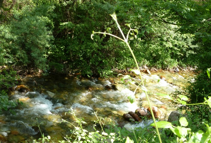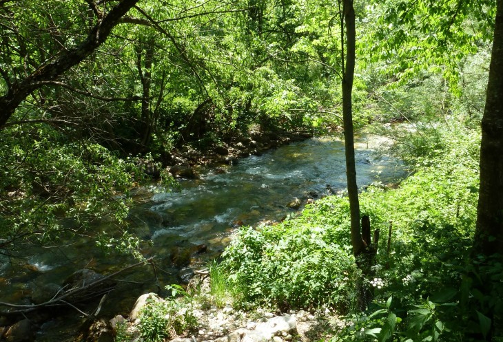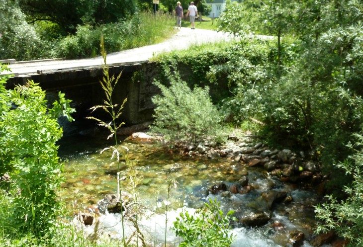 Оставив автобус на дороге, мы идем по тенистой тропинке через мостик над небольшой, но бурной речушкой.