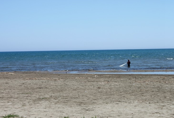 Пока мы кушали, напротив нас мужчина пытался неводом что-то поймать, но, увы… приходил невод «с одною травою морскою»!