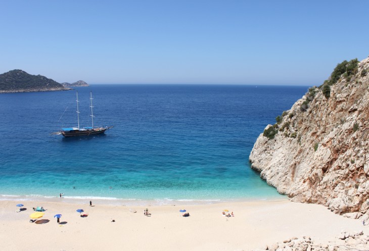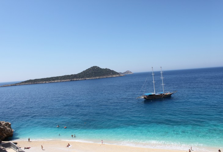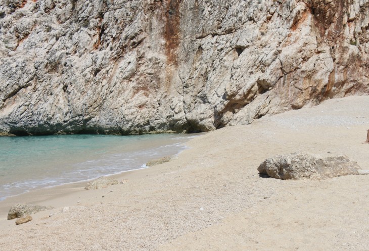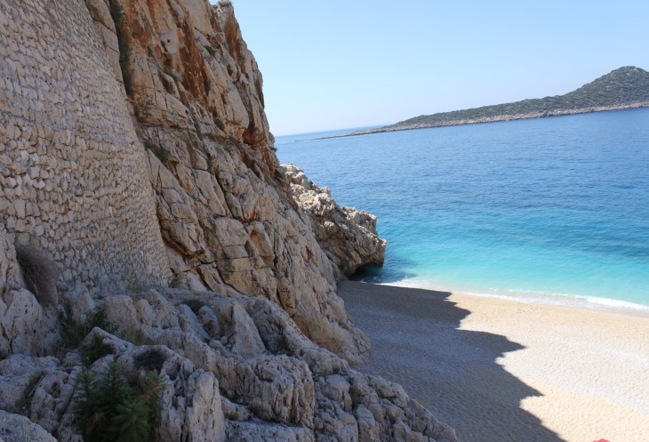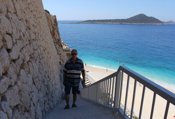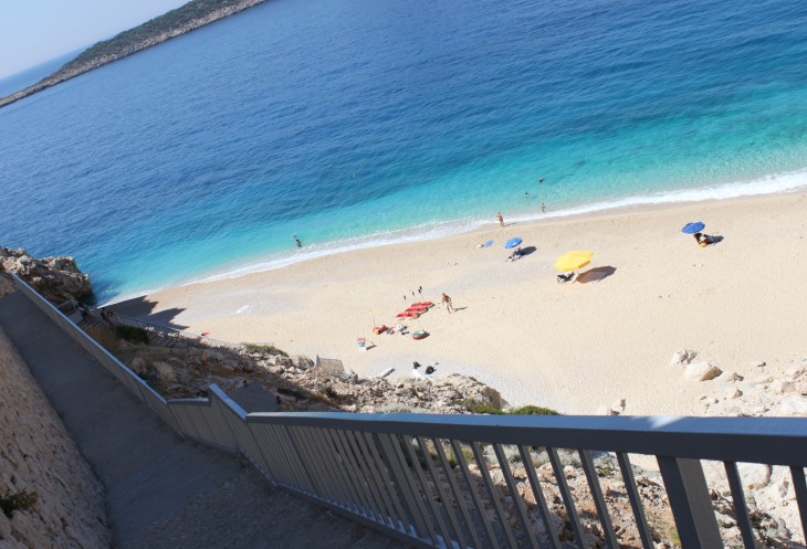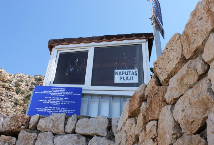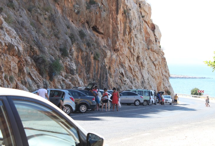 А я жду встречи с пляжем Капуташ, который в прошлом году по незнанию мы проскочили. Открою маленький секрет: с трассы абсолютно не видно прибрежной полосы этого пляжа. Поэтому о нём нужно знать и ориентироваться по примерному месторасположению (между Калканом и Кашем). Можно сориентироваться по будке охраны, крутому повороту, расселине в скале и лестнице, уходящей резко вниз к побережью.