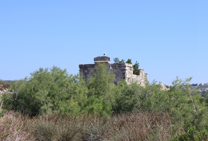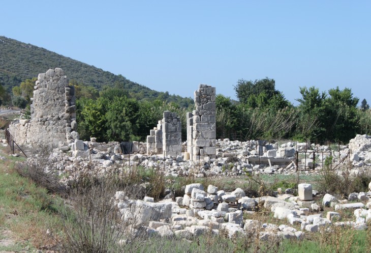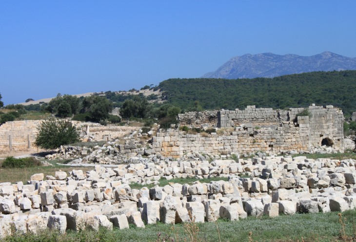 Получилось так, что мы проехали ДО конца, поэтому мой вояж начался не с начала города, а с его конца (если смотреть по направлению от пляжа). По левую руку как раз видны реставрированные части Патары, а справа, к горам, идет равнина с немногочисленными постройками, деревьями и пасущимся домашним скотом.