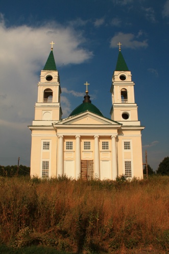 Уже на подъезде к Корсаково (это самый север Орловской области) нам открылось диво дивное - справа от дороги, в нескольких десятках метров от нее, стоял красивейший храм, прямо таки сияющий в лучах солнца... И очень необычный - с двумя колокольнями! Я в России впервые видела подобный храм! Раньше в Орловской области было 2 таких храма, второй не сохранился, был разрушен.