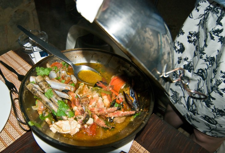Пара слов о сувенирах и "что привезти домой". Ну кроме просто портвейна еще есть наборы с несколькими бутылочками портвейна по 50 мл. Следующим пунктом идут изделия из пробки: сумки, кошельки, ремни, головные уборы и куча того, что трудно себе представить, как там можно использовать пробку. И конечно катаплана - кастрюлина с крышкой, причем где крышка, а где кастрюля не разобрать, по форме обе части одинаковые. Штуковика характерка именно для региона Альгарве (ну так говорят) - в ресторанах везде предлагаются "катапланы с морепродуктами", "катапланы с рыбой" и т.д. Суть готовки - все закидал, поставил на огонь, сиди/лежи и жди. Катаплана в ресторане O'Paulo: