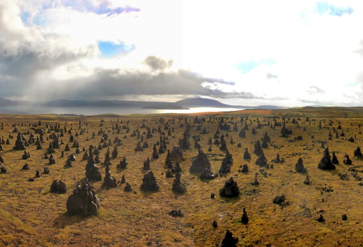 С удовольствием фотографирую, тем более, что выглянуло солнце и даже появилась радуга. Думаю, может тоже сложить пирамидку и с удивлением обнаруживаю, что в пределах разумного нет камней, пригодных для ее постройки! Да и вся площадка, занятая пирамидками, не менее 100 метров диаметром, и стоят-то они чуть ли не ровными рядами, во всяком случае в каком-то порядке.