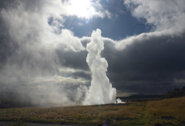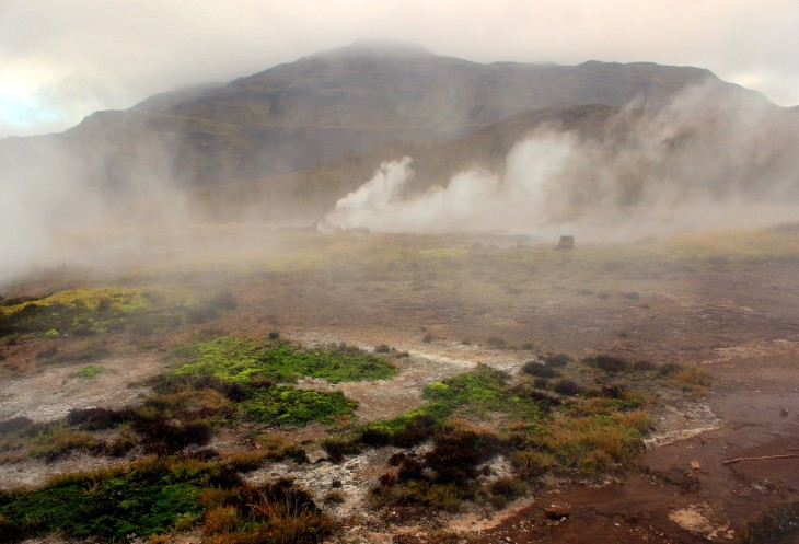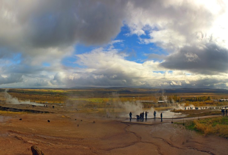Долина гейзеров Хаукадалур (Haukadalur) видна издали, километра за 3-4. Она вся дымится и хорошо заметно, как периодически брызгается по сути единственный действующий гейзер Строккур.