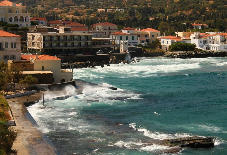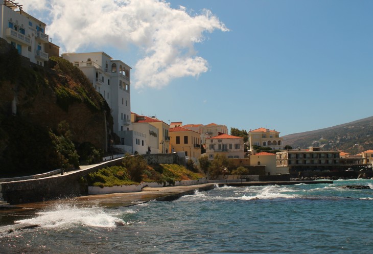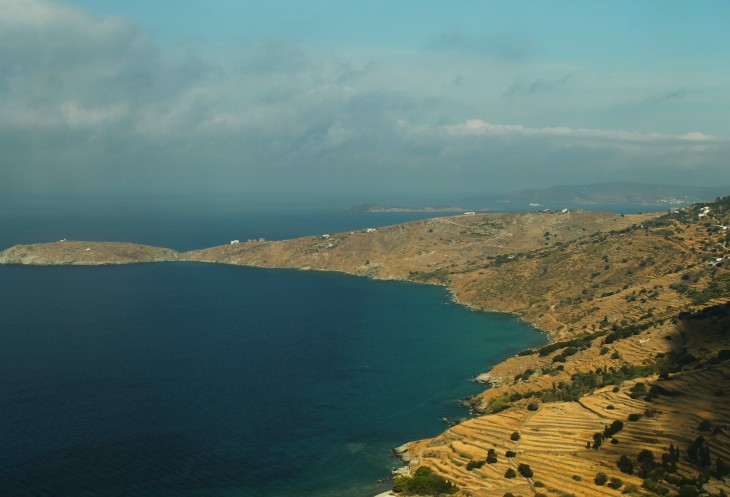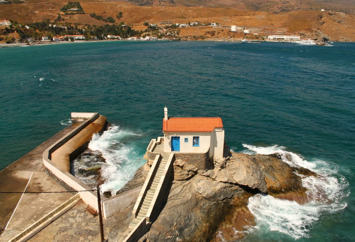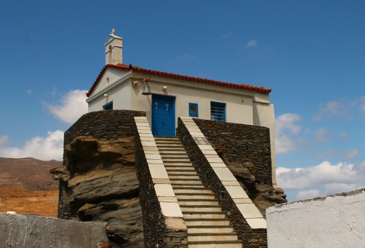 Сразу за бухтой, в которой находятся остатки древнегреческого города Палеополи, дорога раздваивается. Та, которая прямо - идет до известного в серферских кругах небольшого курортного поселка Корфи, а та, которая поворачивает налево, в долину, идет к Хоре, главному городу, "столице" острова Андрос.