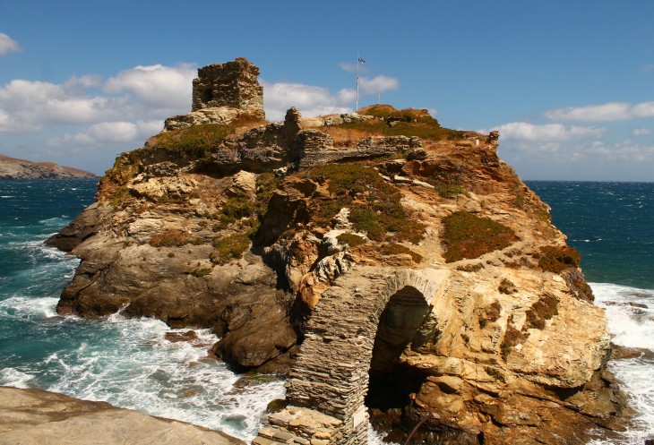 От скалы, на которой находится площадь Рива (она же - своеобразная смотровая площадка), его отделяет арочный мостик, сложенный из плоских камней и как будто бы без сцепляющего их раствора. Мостик называется Камара, а то место, которое я так хотела найти - небольшой, но высокий островок, можно сказать, скала, на котором находятся развалины старой крепости, называется Като Кастро. Нижний замок - так назвали его венецианцы, построившие давным-давно, в 1207 году, эту крепость для защиты Андроса от пиратских набегов.