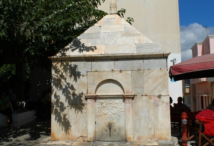 На самой площади, слева - как раз и стоит Археологический музей Андроса, в который я так рвалась. Перед входом в музей - здание из мрамора постройки 1812 (!) года, источник Кабаниса. Из краника можно попить, можно - умыться... При жарком климате - очень актуально!