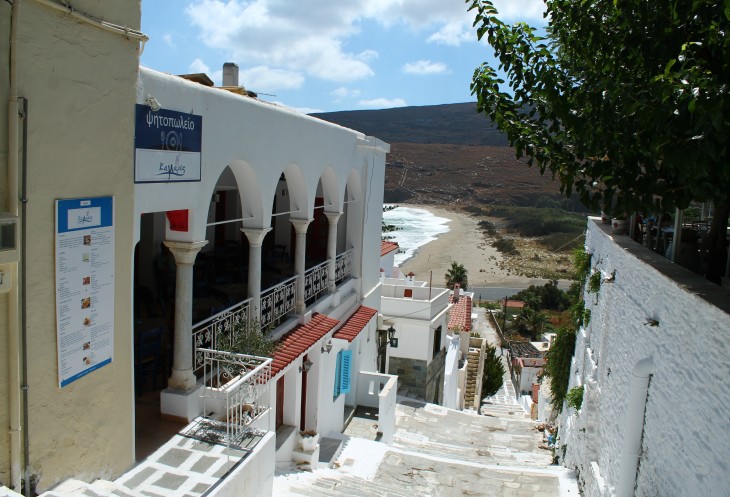 Дорожка влево, к пляжу и бухте Нимборио, более пологая, в лестницу она переходит ниже. Если хотите посетить знаменитый Музей Современного искусства Андроса - то вам сюда, он ниже, ближе к морю. Музей располагается в двух зданиях, по обе стороны от спуска.