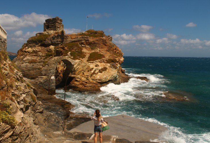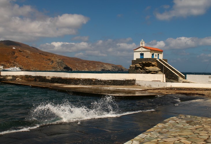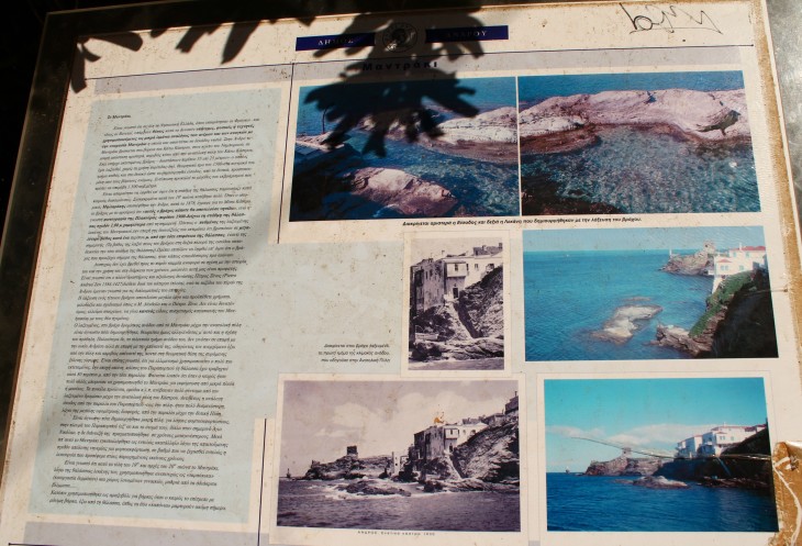 Если есть возможность сильно увеличить фото - то увидите, что на этих "столбах" привязывали лодки! Чтобы, видимо, они не разбивались о камни во время шторма. Андрос ведь всегда был островом рыбаков и мореплавателей...