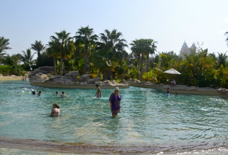 Приливные волны и пороги сопровождали нас по пути. Мы дурачились, играли наперегонки ( Екатеринбург- Челябинск- Уфа- Казань)… потом начали думать как нам оттуда выбраться, чтобы покататься с горок. Скажу за себя…мне и там было не плохо ( я- бояка!), а вот другим захотелось зрелищ и все по той же реке нас направил (персонал) в другое русло, где мы доплыли до башни Ziggurat, построенной в стиле строений Месопотамии и величественно возвышающейся на 30 метров и попали на экскалатор. НЕ поднимаясь с бублика, персонал аккуратно по эскалатору направляет на вверх, где ты уже решаешь какую горку хочешь «опробовать» первой.В этой башни находится 7 водных горок, две из которых проходят через бассейн с акулами. Боялась ужасно…оказывается очень зря. Спустились так же в речку откуда тем же путем поднялись снова на экскалатор . Теперь нам захотелось попасть на горку - The Serpent, для этого нам пришлось подхватить бублики и подняться на этаж выше. Волновалась не только я. Но раз уж приехали… Быстрый спуск по спирали в самый центр башни за какие-то секунды и мы попали в бассейн с акулами, скорость мыла настолько маленькой, что мы успели разглядеть всех, кто плавал над и сбоку от нас. Прикольно!