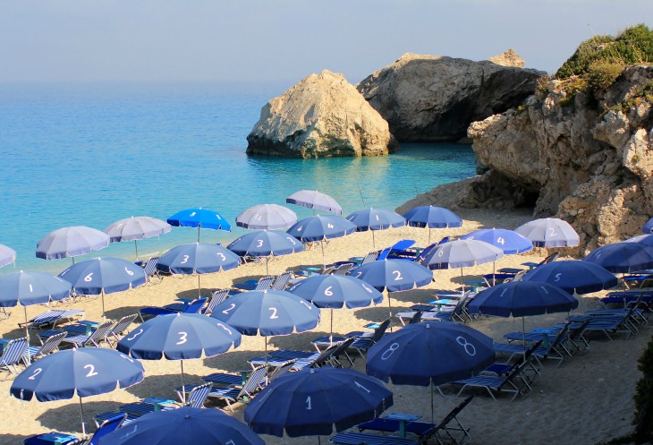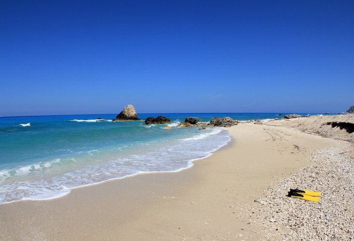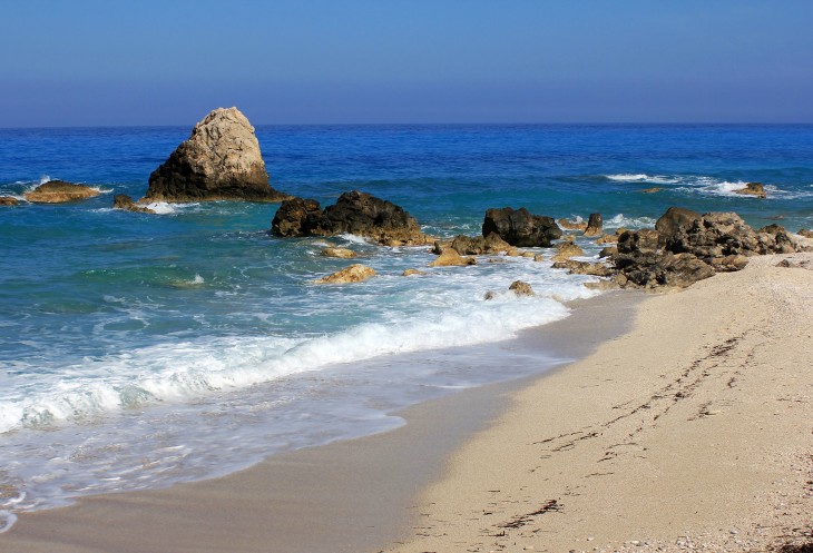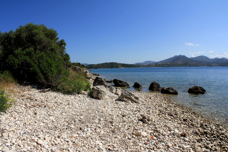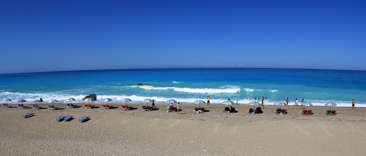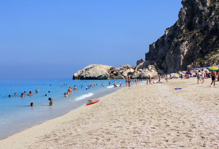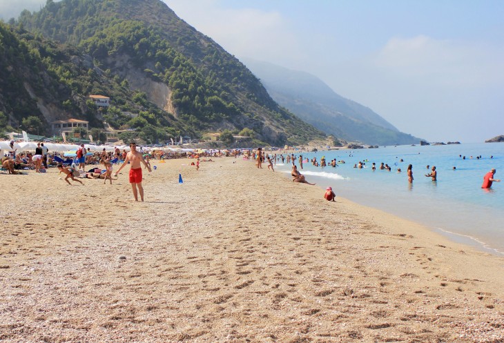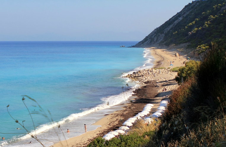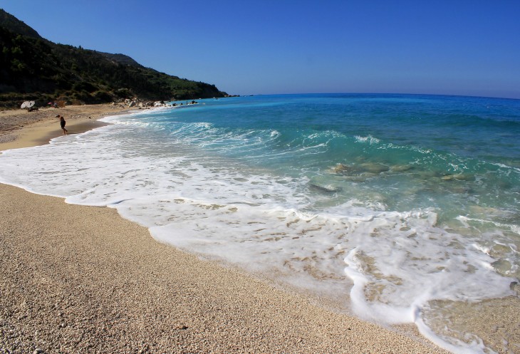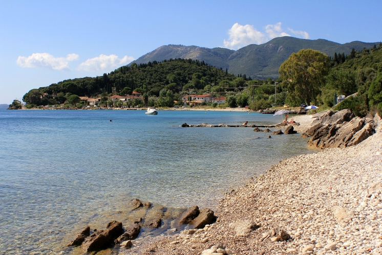 Между столицей острова Лефкадой и поселком Никиана есть дикий пляж Лигия. С огромными камнями на берегу и в море, крупной галькой и понтоном – иначе зайти в море очень сложно, даже в специальной обуви.