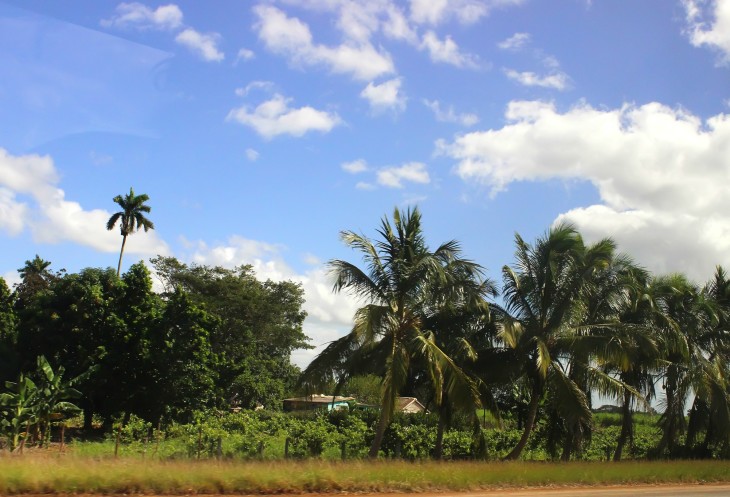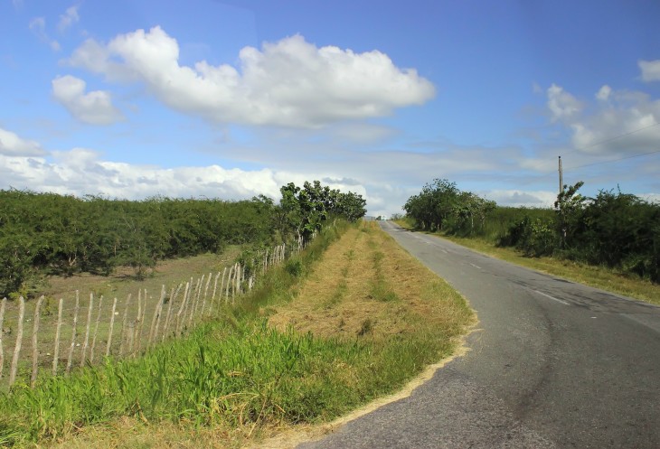 Дорога на Сьенфуэгос очень красива, километры пальмовых зарослей, сахарного тростника и фруктовых полей сменяются небольшими деревушками, а потом снова поля, поля. Кстати собирают сахарный тростник, как впрочем и все остальное вручную поскольку наибольший процент сахара содержится в самом начале ствола. Мачетеро (люди рубящие сахарный тростник с помощью мачете) срезают тростник как можно ближе к земле. Машинный способ уборки тоже используется, но не так часто.