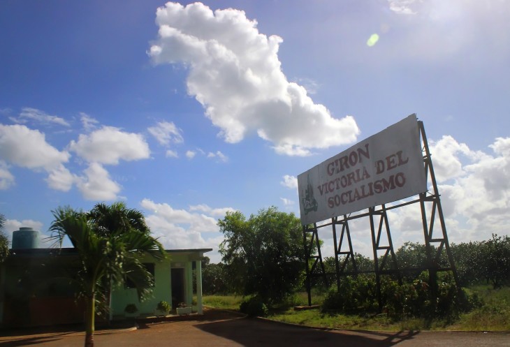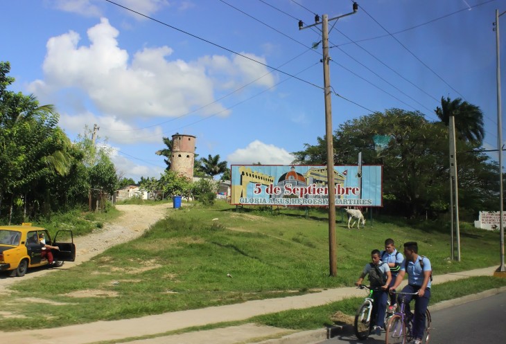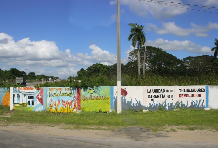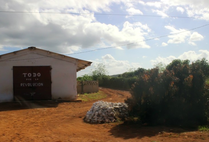 Вот например свежее засаженное поле сахарного тростника, кстати рядом склад с революционной надписью «Все для Революции». На кубе подобное встречается довольно часто.
