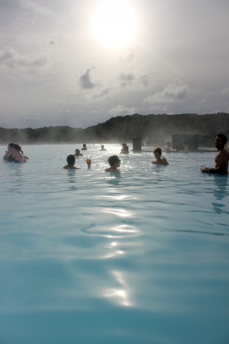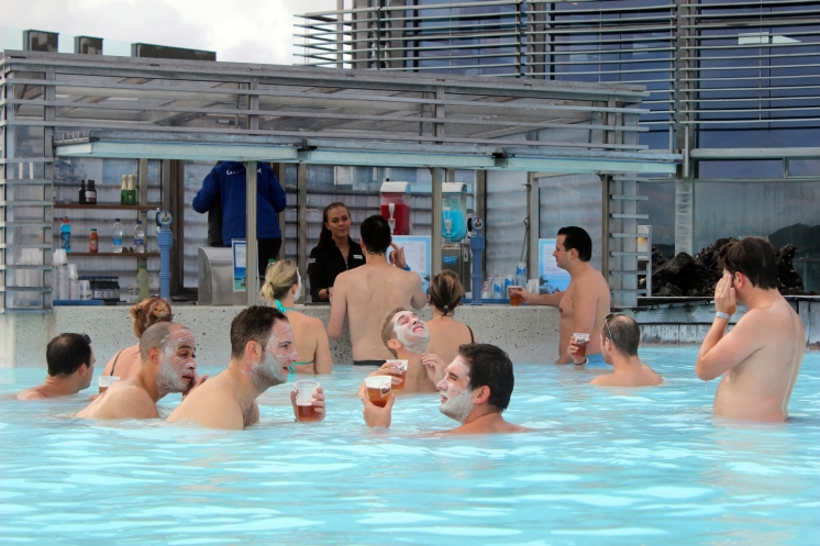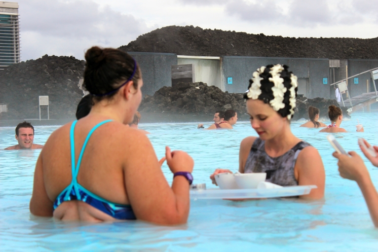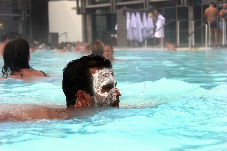 Искупаться здесь недешевое удовольствие. Даже если не брать халат или полотенце, билет стоит около 1500 рублей. За эти деньги получаешь право пользования индивидуальным шкафчиком и пропуск на берег лагуны. Сначала предлагают смыть с себя всякую бяку в душе, а уже потом купание. Выхожу на берег после душа, а температура воздуха всего около 7 градусов, да еще с ветерком! Замерз моментально и даже начал сомневаться, что мне вообще хочется купаться. Буквально пересилил себя, заставил спуститься в воду и не пожалел. Согрелся быстро. Вода градусов 40, а местами, где она, видимо, прибывает из под земли, реально горячая, думаю градусов 50-60! Над водой парок из-за разницы температур. В воде тусуется несколько десятков человек