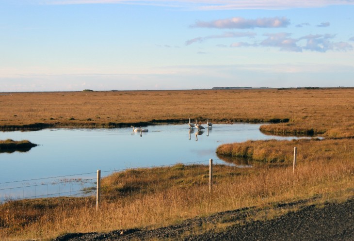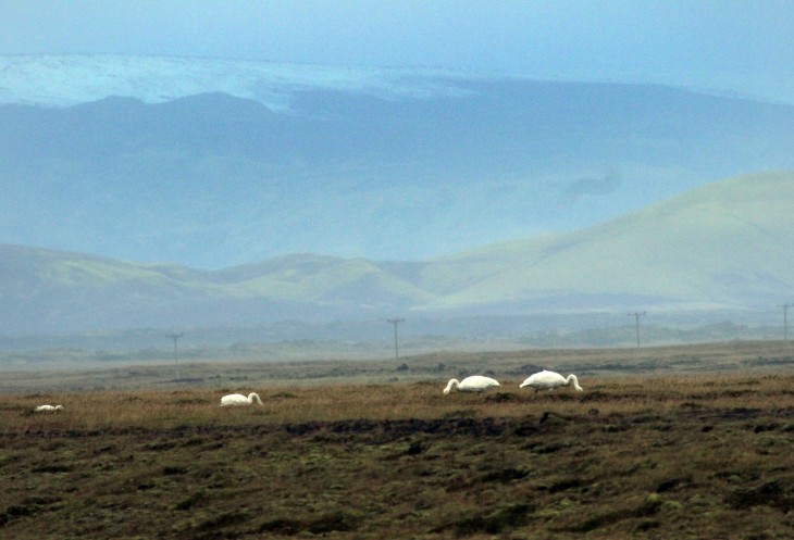 Вскоре становится совсем светло и видно, что слева все ближе и ближе к дороге подбираются горы, с голубоватыми языками ледников. На фоне этой красоты мирно и беззаботно пасутся овечки и с ними, на тех же пастбищах «пасутся» кто бы Вы думали (?) – лебеди!