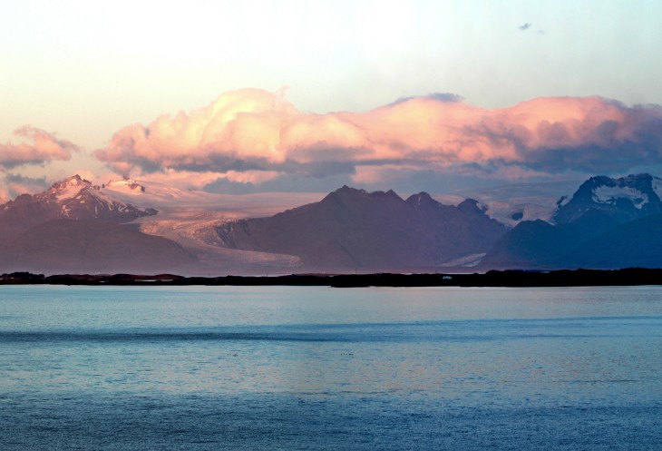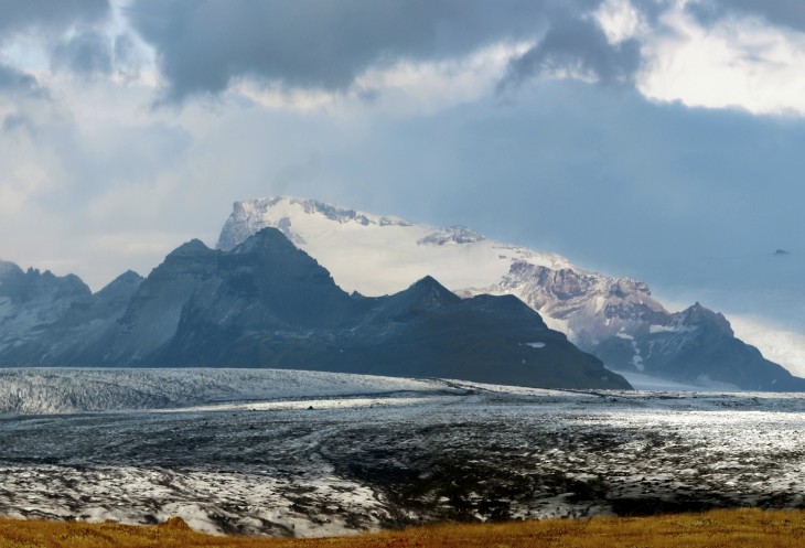 Дальше на восток дорога идет между океаном справа и горами слева, разделяющими многочисленные языки все того же огромного ледника Ватнаёкюдль.