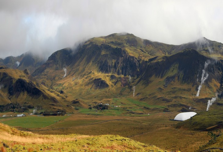 В городке проживает около 2 500 человек, которые обеспечивают всю Исландию фруктами и цветами, выращиваемыми в огромных оранжереях (вон то большое белое пятно чуть правее центра снимка).