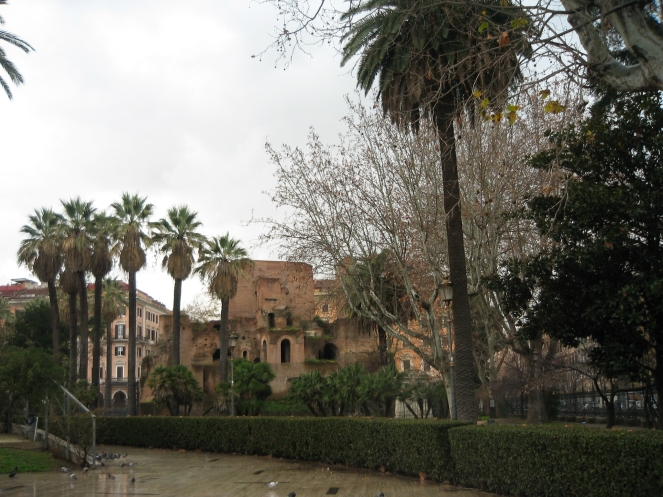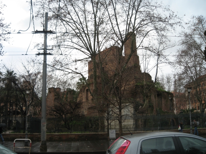 Дальше я вышла на довольно интересное место - площадь Витторио Еммануэле (или Виктора Эммануила II, того самого, которому посвящен огромный монумент, он же "Алтарь Отечества"). В парке на площади имеются какие-то античные развалины. Найти конкретную информацию о них не удалось, в некоторых статьях и путеводителях написано, что это развалины фонтана, построенного при императоре Александре Севере. Сама площадь была построена после объединения Италии в 1870 г. Как говорится в путеводителе DK, "хотя площадь и была названа в честь первого короля объединенной Италии, в ней нет ничего королевского" (перевод мой).