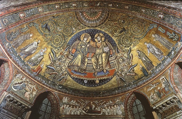 От вокзала я снова отправилась в сторону центра и наконец-то зашла в базилику Санта Мария Маджоре. Там находится одна из древних римских чудотворных икон Salus Populi Romani ("Спасение римского народа"), по преданию, написанная св. апостолом и евангелистом Лукой. Вообще в Риме множество чудотворных икон Божией Матери, но находятся они обычно над алтарем, так что подойти совсем близко нельзя. Еще в базилике Санта Мария Маждоре дивной красоты византийские мозаики. Их довольно много, и некоторые очень древние, но сразу бросается в глаза, конечно, та, что в в куполе над главным алтарем.