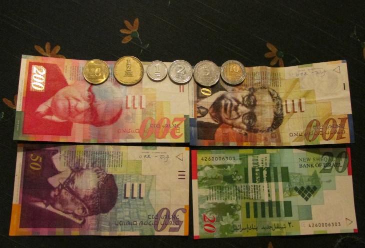Валюта в Израиле это шекели - купюры 200,100,50 и 20, монеты 10, 5, 2, 1, полшкеля и 10 агарот (типа 10 копеек). Первый раз перепутал 10 шекелей и 10 агорот и совал водителю эти 10 местных копеек оплачивая проезд. Долго думал чем ему не нравятся мои деньги и чего это он так истошно орет)).