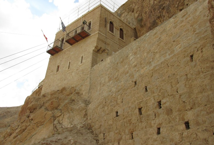 Сам монастырь впечатляет тем, что построен буквально на узком уступчике отвесной скалы на высоте метров 200-300 от подножия. Здесь есть собственно церковь, кельи (все вырублено в скалах) и грот, в котором по преданию 40 дней провел Иисус, сопротивляясь искушения дьявола (или сатаны, как правильно - см. библию).